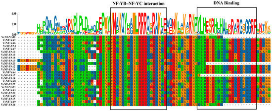 Multiple sequence alignment of VcNF-YAs. The amplified colored letters above protein sequences indicate motif. Different colors of letters represent different amino acids.