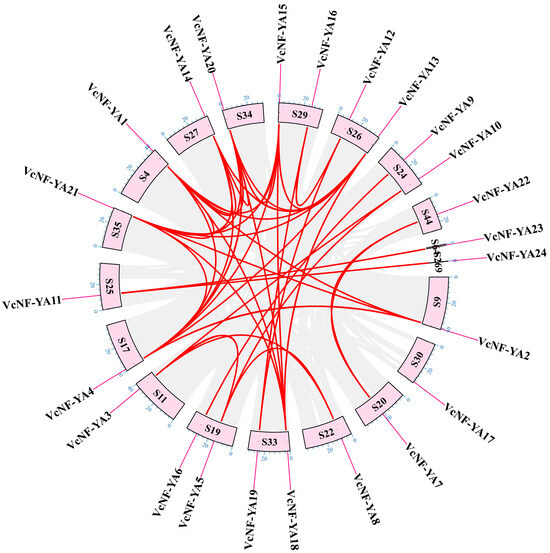 Chromosomal localization and intraspecific collinearity analysis of VcNF-YA genes. Pink boxes represent scaffolds; scale is shown in blue on each pink box; purple line indicates the location of the NF-YA genes; gray lines in the background indicate the synteny blocks within the genome; red curve denotes a pair of synteny event.