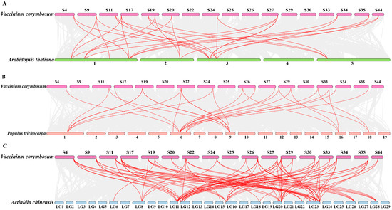 Interspecific collinearity analysis of NF-YAs between V. corymbosum and A. thaliana (A), V. corymbosum and P. trichocarpa (B), and V. corymbosum and A. chinensis (C). Grey lines in the background represent collinear blocks in V. corymbosum and the other three plants, respectively. Red lines represent collinear NF-YA gene pairs. The numbers on the chromosomes or scaffolds indicate chromosome or scaffold number.