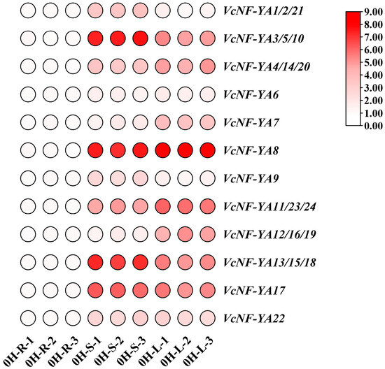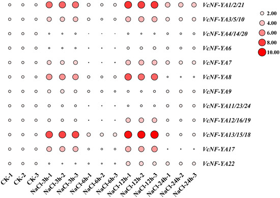 Expression patterns of VcNF-YAs under salt treatment. The concentration of salt treatment is 200 mM, and the treatment time is 0 h (CK), 3 h, 6 h, 12 h, and 24 h. The 2−ΔΔCt method was used to calculate the transcription levels of VcNF-YAs, and the log2 (sample/control) value of each VcNF-YA was used to show its relative expression level. Expression level indicators were laid on the right side of heatmaps. Larger size and deeper red color of a circle indicate higher relative expression level.