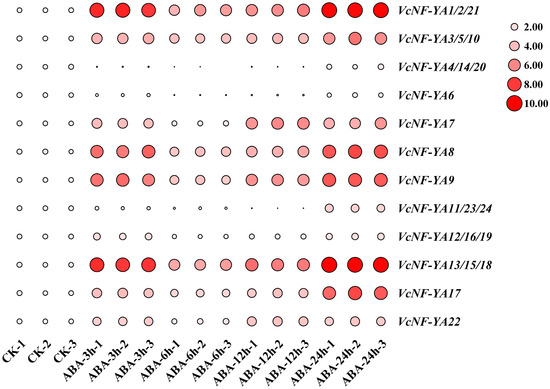 Expression patterns of VcNF-YAs under ABA treatment. The concentration of ABA treatment is 100 μM, and the treatment time is 0 h (CK), 3 h, 6 h, 12 h, and 24 h. The 2−ΔΔCt method was used to calculate the transcription levels of VcNF-YAs, and the log2 (sample/control) value of each VcNF-YA was used to show relative expression levels. Expression level indicators were laid on the right side of heatmaps. Larger size and deeper red color of a circle indicate higher relative expression level.