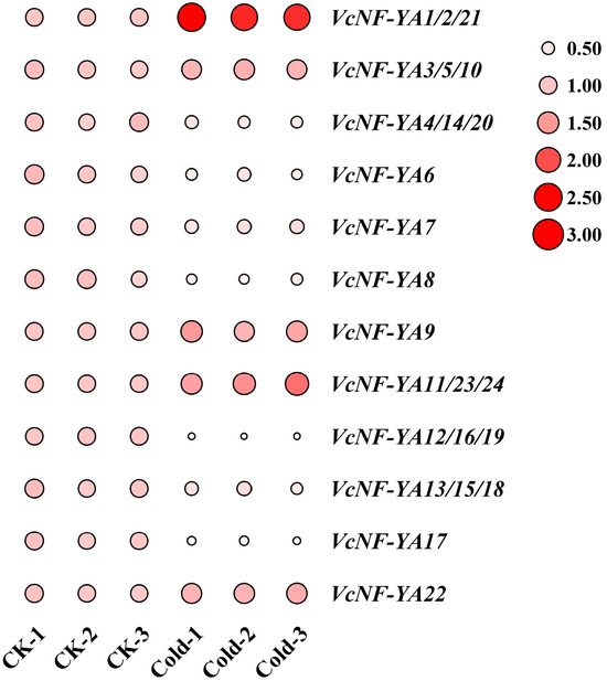 Expression analysis of VcNF-YAs under cold stress treatment by qRT-PCR. The concentration of salt treatment is 4 °C, and the treatment time is 0 h (CK) and 3 h. The 2−ΔΔCt method was used to calculate the transcription levels of VcNF-YAs, and the log2 (sample/control) value of each VcNF-YA was used to show its relative expression level. Expression level indicators were laid on the right side of heatmaps. Larger size and deeper red color of a circle indicate higher relative expression level.