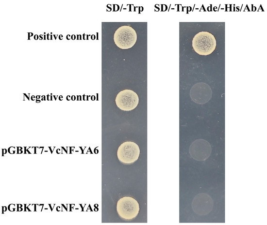 VcNF-YA6 and VcNF-YA8, as representatives of VcNF-YAs responsive to multiple abiotic stress treatments, were selected for the detection of transcription-activating activity. VcNF-YA6 and VcNF-YA8 genes were introduced into pGBKT7 vector and transformed into yeast cells. Neither the negative control nor the yeast transformed with pGBKT7-VcNF-YA6, and pGBKT7-VcNF-YA8 was able to grow on the nutrition-deprived culture medium added with AbA (Figure 12). It showed that VcNF-YA6 and VcNF-YA8 have no transcription-activating activity.