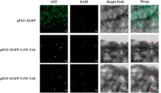 VcNF-YA6 and VcNF-YA8 genes were introduced into pFGC-eGFP vector. Transient transformation of tobacco leaf cells was performed using Agrobacterium containing the plasmids of pFGC-eGFP, pFGC-eGFP-NF-YA6, and pFGC-eGFP-NF-YA8, respectively. Green fluorescence distribution indicates subcellular localization. As shown in Figure 13, green fluorescence signal was able to be observed across the entire tobacco leaf cell transformed with pFGC-eGFP. In contrast, green fluorescence signal was only detected in the nucleus of tobacco leaf cells transformed with pFGC-eGFP-VcNF-YA6 and pFGC-eGFP-VcNF-YA8. It indicated that VcNF-YA6 and VcNF-YA8 proteins were localized in the nucleus. This result is consistent with the basic characteristics of nuclear localization of most transcription factors.