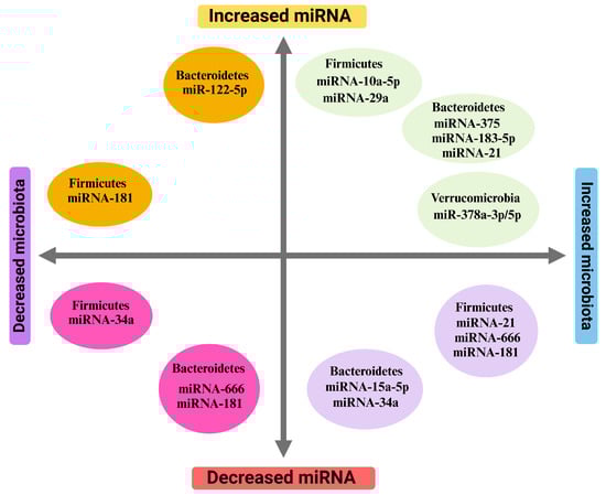 High-fat feeding in mice results in complicated changes in gut microbiome composition and the expression profile of miRNA. This diet results in an increased abundance of the Firmicutes phylum, which is associated with elevated hepatic levels of miRNA-34a and miRNA-29a [,]. Conversely, higher hepatic expression of miRNA-666 and miRNA-21 correlates with a decline in Firmicutes and a rise in B. acidifaciens in the gut []. This diet also causes a reduction in Bacteroidetes alongside decreased miRNA-122 levels [].