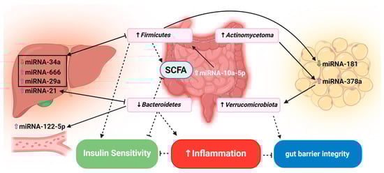 The Firmicutes phylum is positively correlated with hepatic miRNA 34a, while being negatively correlated with hepatic miRNA-666 [,]. Similarly, the Bacteroidetes phylum is positively correlated with hepatic miRNA 122 and circulating miRNA 375 [,]. Additionally, the Akkermansia from Verrucomicrobiota phylum displayed positive correlation with fecal miRNA-42f5-3p and WAT miRNA-378a []. The Actinomycetota phylum, and specifically Bifidobacterium genus, is positively associated with adipose tissue miRNA-378a []. It is worth noting that the miRNA-378a family in WAT and liver demonstrated associations with SCFA-producing bacteria such as Lactobacillus genus [].