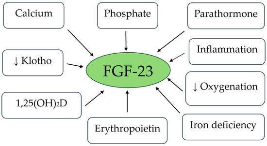 - David, V.; Francis, C.; Babitt, J.L. Ironing out the cross talk between FGF23 and inflammation. Am. J. Physiol.-Ren. Physiol. 2017, 312, F1–F8. [Google Scholar] [CrossRef] [PubMed]