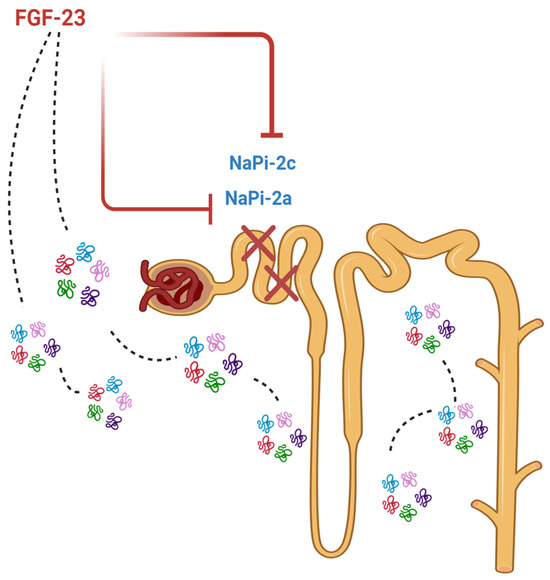 FGF-23, by binding to its own receptor and to the Klotho coreceptor, induces the downregulation of the cotransporter Na/Pi IIa and Na/Pi IIc transporters with a consequent phosphaturic effect.