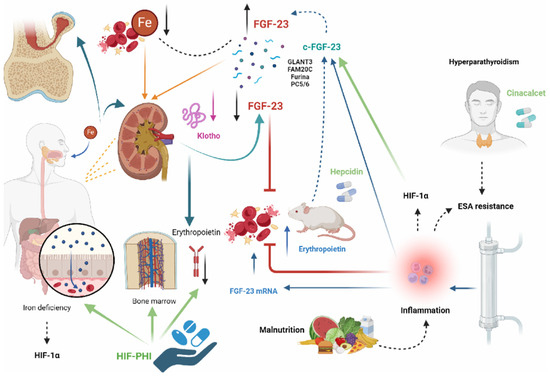 Anemia [131,132] significantly affects daily activities, cardiovascular health, and overall prognosis in CKD patients [133,134,135]. The development of recombinant human Epo (rhEpo) over 30 years ago revolutionized the treatment of anemia in CKD [136]. The interaction of rhEpo on serum FGF-23 levels is complex and multifaceted. The role of Epo as a physiological regulator of FGF-23 production was investigated in a mouse model of acute hemorrhage. A severe and acute reduction in blood volume, leading to tissue ischemia, stimulated Epo synthesis. It resulted in the proliferation of erythroid cells in the bone marrow and the release of immature erythrocyte precursors into circulation. In these mice, an increase in Epo levels accompanied by an increase in plasma levels of the C-terminal fragment of FGF-23 was observed within 6 h of the hemorrhagic event [137].