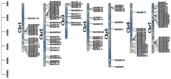 A Blastp search on the R. × hybrida whole-genome protein sequences was conducted using 147 Arabidopsis AtAP2/ERF protein sequences as query sequences to identify all members of the protein family. The histone domain’s hidden Markov model (HMM) file, PF00847, was obtained from the Pfam protein family database. All protein sequences were aligned with these HMMs using TBtools software, and incomplete sequences and candidate sequences without the corresponding characteristic domains were excluded from the Pfam, SMART (Simple Modular Architecture Research Tool), and CDD (Conserved Domains Database) databases. mitochondria, and RhDREB14 and RhDREB42 located in the cytoplasm. TBtools software was also used to analyze the chromosomal locations of RhAP2/ERF family genes (Figure 1), and the results showed that most of them were located in high-gene-density positions. Chromosome chr2 had the most RhAP2/ERF genes (28), while chromosome chr5 had the fewest, only eight. Numbered according to their positions on the 7 rose chromosomes, 127 members of the RhAP2/ERF gene family were identified from the rose genome (Table S1).