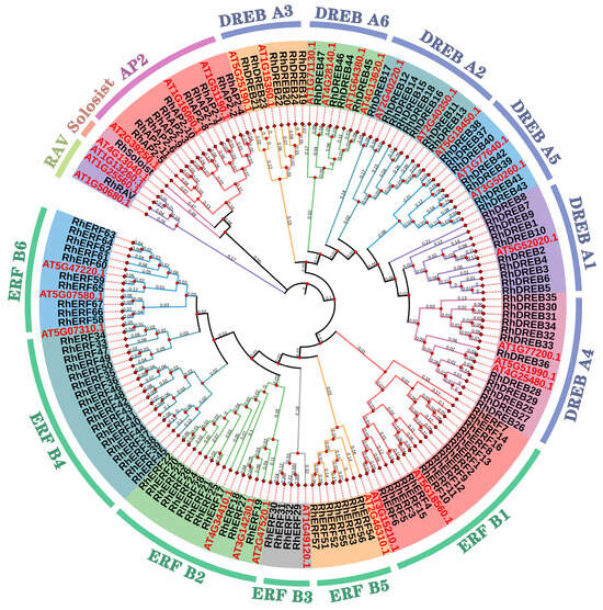 A RhAP2/ERF protein–protein interaction network was constructed using the Search Tool for the Retrieval of Interacting Genes/Proteins database (https://string-db.org/, accessed on 15 June 2024), with Arabidopsis AP2/ERF proteins as templates [44]. Based on the protein interaction score (≥0.400), the number of interactions was shown to be five. The results were imported into Cytoscape software to visualize protein–protein interaction networks [45].