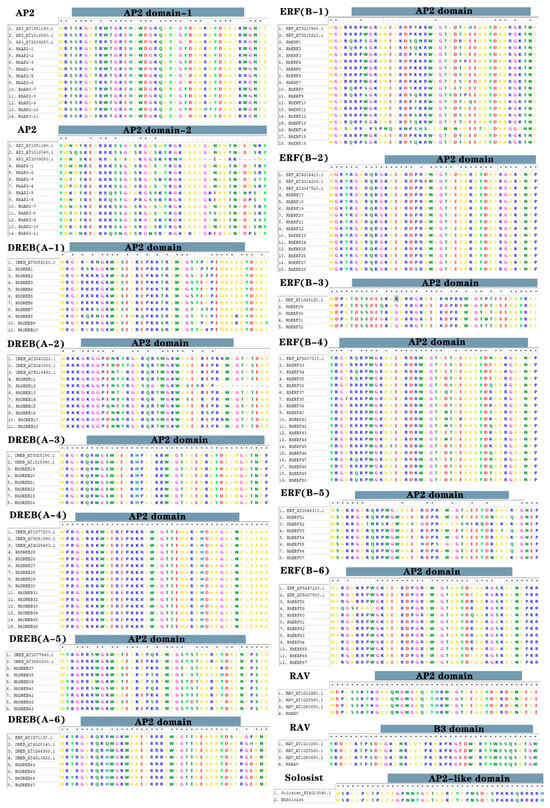 The multiple sequence alignment of the AP2/ERF protein family members via the ClustalW tool in MEGA7 (v7.0.14) software showed a high degree of similarity among them. The positions of the intermediate regions were highly similar, and they contained the conserved structural domains of the AP2/ERF protein family (Figure 3). Among the 127 RhAP2/ERF proteins, most of the AP2/ERF domains were highly conserved, with AP2 subfamily members having two AP2 domains, while ERF, DREB, and RAV subfamily members each had only one AP2 domain. RAV subfamily members had one AP2 domain and one B3 domain, while Soloist subfamily members had domains that were similar to AP2. In summary, the AP2 subfamilies are mostly composed of two AP2 conserved domains, while the ERF, DREB, RAV and Soloist subfamilies are mostly composed of one AP2 conserved domain.