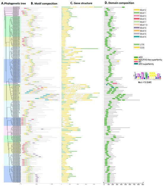 Phylogenetic tree, motif composition, gene structure, and domain composition of RhAP2/ERF: (A) Phylogenetic tree of RhAP2/ERF protein. (B) The motif composition of RhAP2/ERF. (C) The gene structure of RhAP2/ERF. (D) Domain composition of the RhAP2/ERF gene.