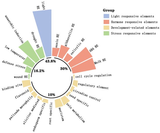Types of cis-elements in the RhAP2/ERF gene promoter of Rosa × hybrida and the distribution of quantities. RE = responsive element.