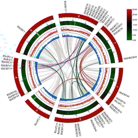 Gene replication of the AP2/ERF gene family in Rosa × hybrida. The colored lines represent replicated gene pairs in RhAP2/ERF, while the gray lines represent collinear gene pairs in the genome.