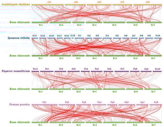 Collinear analyses of AP2/ERF genes between Rosa × hybrida and four plants (Arabidopsis thaliana, Ipomoea triloba, Papaver somniferum, and Prunus persica). The gray lines between rose and other plants represent collinear blocks in wide regions of the genomes, while red lines show the orthologous relationships of AP2/ERF genes.