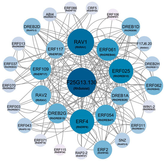 AP2/ERF protein interaction network in roses, visualized using Cytoscape (v3.10.0) software. The blue ball (node) represents the RhAP2/ERF gene. The connecting lines represent potential regulatory relationships, and the text displays the predicted gene names. The larger the size and darker the color of the ball, the more it interacts with other proteins.