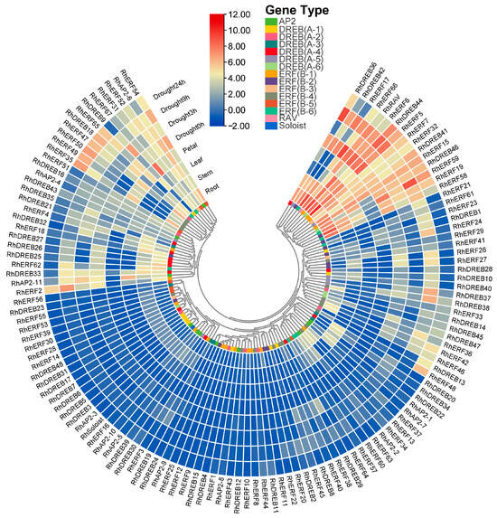 Heat map of AP2/ERF gene expression in Rosa × hybrida in different tissues and under different durations of drought treatments. The colors from blue to red represent different levels of expression. Blue represents low expression, red represents high expression.