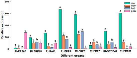 Relative expression levels of eight RhAP2/ERF genes were determined by qRT-PCR in different rose organs. Data represent the means ± SEs of three reproducible experiments. Bars with lowercase letters above the columns indicate significant differences between the four organs at p < 0.05 (Tukey’s test).