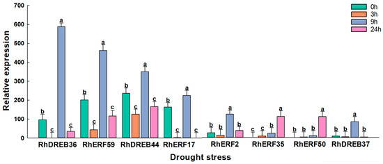 Relative expression levels of 8 RhAP2/ERF genes in Rosa × hybrida leaves were determined using qRT-PCR after 0 h (CK), 3 h, 9 h, and 24 h of drought stress treatment. Data represent the means ± SEs of three reproducible experiments. Bars with lowercase letters above the columns indicate significant differences between the different treatments at p < 0.05 (Tukey’s test).