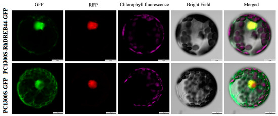 Subcellular localization of RhDREB44 protein in Arabidopsis protoplasts. From left to right are RhDREB44-GFP green fluorescent protein, RhDREB44-RFP red fluorescent protein, chlorophyll fluorescence, bright field, and merged overlay photos (scale bar = 10 μm).