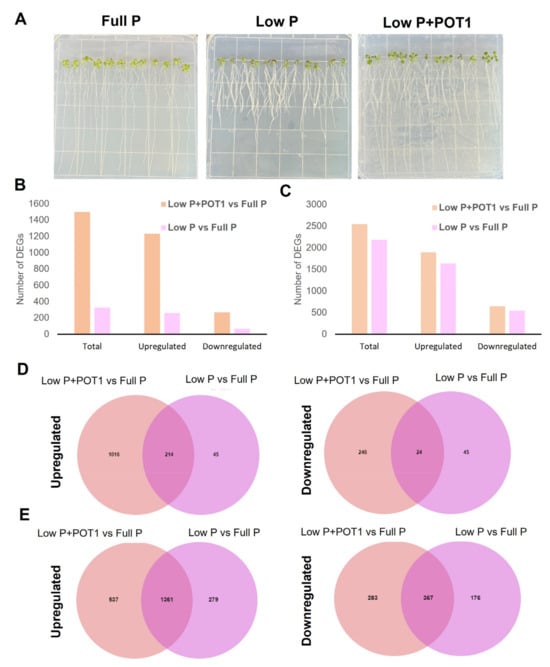 Transcriptome analysis of Arabidopsis thaliana upon Penicillium olsonii TLL1 (POT1) treatment. (A) A. thaliana grown under full P and low P conditions and with POT1 under low P conditions. Differentially expressed genes in (B) roots and (C) shoots of A. thaliana after inoculation with POT1. DEG analysis was performed by comparing the pairwise combinations low P + POT1 vs. full P and low P vs. full P. Venn diagrams were plotted to show the differentially co-expressed upregulated and downregulated DEGs in both (D) roots and (E) shoots.