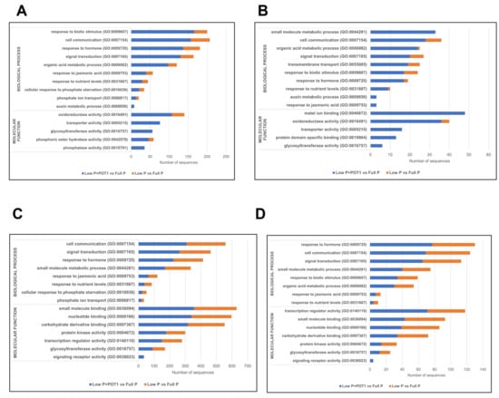 To understand the functions of the DEGs, GO enrichment analysis was performed in roots and shoots of A. thaliana, and GO categories enriched in different treatments were identified (Figure 2, Table S5). Although some of the GO terms, viz., oxidoreductase activity (GO:0016491) and phosphoric ester hydrolase activity (GO:0042578), under the molecular function (MF) category were enriched commonly in both low P + POT1 vs. full P and low P vs. full P, the number of sequences were comparatively higher in the roots of low P + POT1 vs. full P. The MF categories uniquely enriched in low P + POT1 vs. full P included phosphatase activity (GO:0016791), glycosyltransferase activity (GO:0016757), transporter activity (GO:0005215), etc. Similarly, the number of sequences under the GO terms, viz., response to biotic stimulus (GO:0009607), response to hormone (GO:0009725), signal transduction (GO:0007165), etc., under the biological process (BP) category were significantly higher in the roots of POT1-treated plants. The GO term, auxin metabolic process (GO:0009850), under the BP category was uniquely enriched in the roots of POT1-treated plants. In shoots, the GO terms under the MF category, viz., transcription regulator activity (GO:0140110), nucleotide binding (GO:0000166), etc., were substantially higher compared with the untreated plants, while the GO term signaling receptor activity (GO:0038023) was uniquely enriched. Among the GO terms under the BP category, signal transduction (GO:0007165) and response to hormones (GO:0009725) were prominent in the shoots of POT1-treated plants compared with the untreated plants.