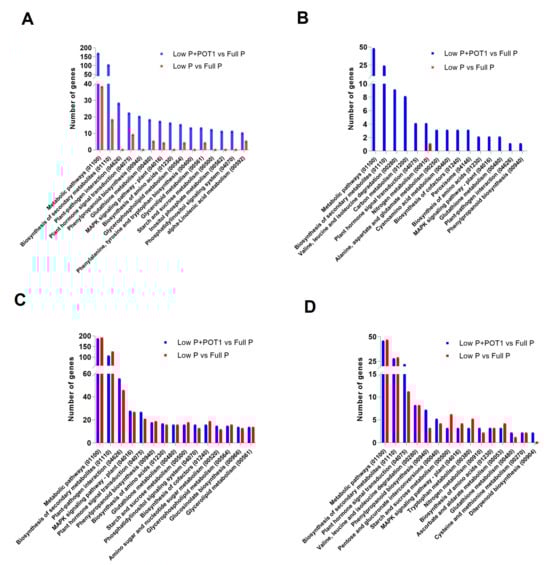 GO enrichment analysis was performed for DEPs in roots and shoots of A. thaliana, and GO categories enriched in different treatments were identified (Figures S2–S5, Table S9). In roots, the GO terms, viz., protein phosphorylation, transmembrane transport, protein kinase activity, and oxidoreductase activity, were among the highly enriched GO terms in low P + POT1 vs. low P, while in shoots, cysteine-type peptidase activity under molecular function was the highly enriched GO term. In low P vs. full P, the GO terms, RNA binding, transferase activity, and cellular carbohydrate metabolic process were predominantly enriched in roots. On the other hand, the metabolic process under the biological process category was enriched in shoots. The KEGG analysis resulted in the identification of major pathways enriched in the DEPs of POT1-treated plants (Figures S6–S9, Table S9). In the low P + POT1 vs. low P comparison, plant–pathogen interaction, purine metabolism, and glyoxylate and dicarboxylate metabolism were among the overrepresented pathways in roots. In shoots, pathways such as plant hormone signal transduction, amino sugar and nucleotide sugar metabolism, and protein processing in the endoplasmic reticulum were overrepresented in low P + POT1 vs. low P. In the low P vs. full P comparison, metabolic pathways and biosynthesis of secondary metabolites were abundantly enriched in both roots and shoots.