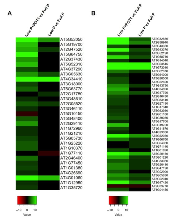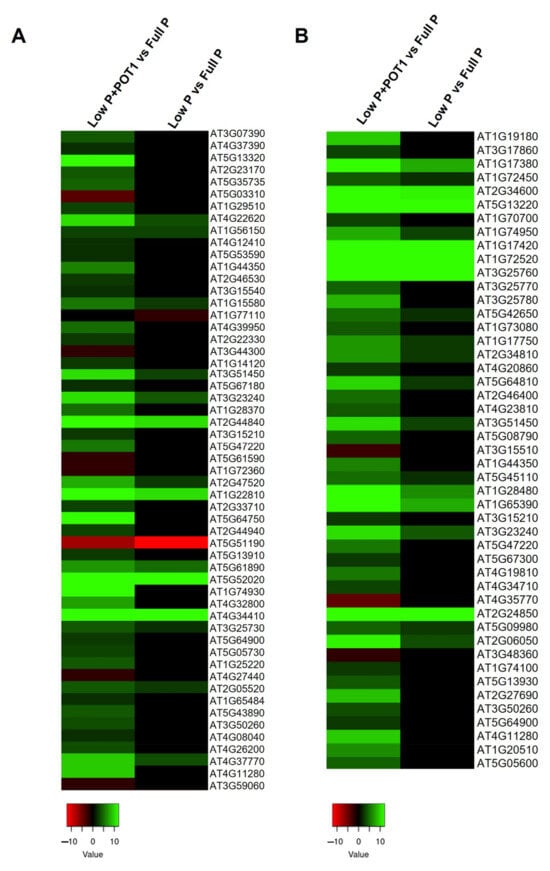 Heat map of the differentially expressed genes (DEGs) in Arabidopsis thaliana treated with Penicillium olsonii TLL1 (POT1) under low P conditions. (A) DEGs related to root development. (B) DEGs related to phosphate starvation in the pairwise comparisons, low P + POT1 vs. full P and low P vs. full P, in roots. The heat maps were constructed using the log2 fold change values, and the genes in green and red represent upregulated and downregulated genes, respectively.