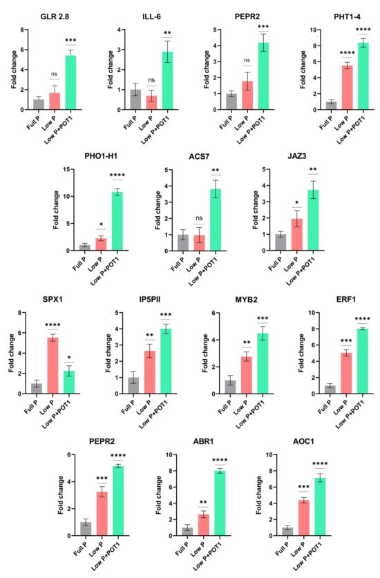 To further validate the RNA-seq results, we selected seven differentially expressed genes (DEGs) from both roots and shoots for qPCR analysis. As illustrated in Figure 6, the qPCR results showed a similar expression trend to the RNA-seq results (Table S7), confirming the accuracy of the Illumina sequencing analysis. Specifically, the DEGs GLR2.8, ILL6, PEPR2, PHT1-4, PHO1-H1, ACS7, and JAZ3 were markedly enhanced in the roots following POT1 treatment. In the shoots, the expression of genes annotated as SPX1, IP5PII, MYB2, ERF1, PEPR2, ABR1, and AOC1 were validated by qPCR.