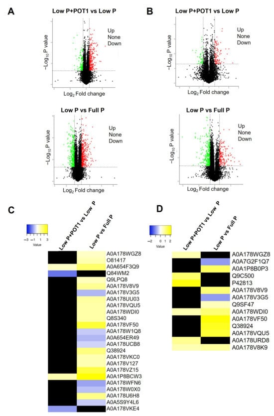 Proteome analysis of Arabidopsis thaliana treated with Penicillium olsonii TLL1 (POT1). Volcano plots representing the differentially expressed proteins in the pairwise combinations, low P + POT1 vs. low P and low P vs. full P, in (A) roots and (B) shoots are shown. Proteins exhibiting a fold change greater than 1.5 and less than 0.67 with a p value of <0.05 were considered significantly differentially expressed for upregulated and downregulated proteins, respectively. Heat maps of the differentially expressed proteins (DEPs) related to plant growth in the (C) roots and (D) shoots of A. thaliana treated with POT1 under low P condition are represented. The heat maps were constructed using the log2 fold change values, and the genes in yellow and blue represent upregulated and downregulated genes, respectively.