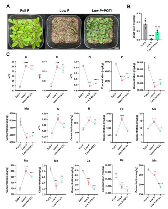 We were able to identify the changes in shoot nutrient elements under distinct phosphate conditions (Figure 8). Elemental analysis showed that concentrations of N, P, and K were increased in low P shoots upon POT1 treatment, although they were significantly lower in untreated low P than in full P shoots. On the other hand, the concentrations of C, S, B, Na, Cu, and Fe were lowered in the shoots of POT1-treated plants under low P even though they were substantially higher in untreated low P than full P. Furthermore, POT1 treatment decreased the amounts of Co, Ca, and Mn that had already decreased under low phosphate deficiency stress.