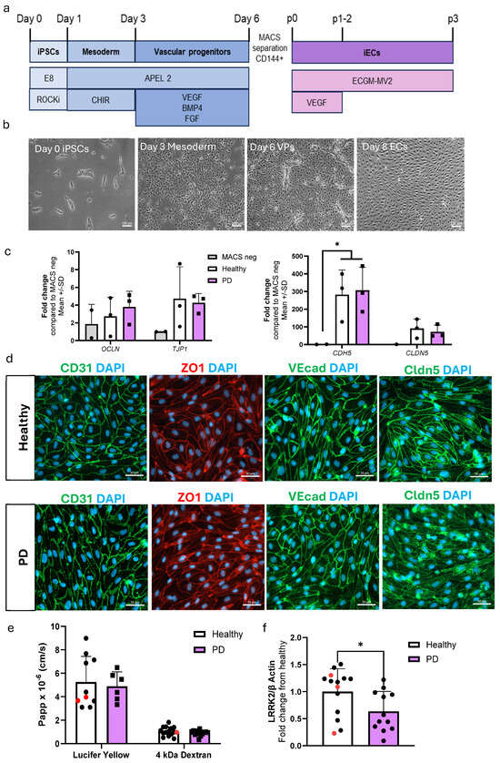 Differentiation and characterization of hiPSC-derived endothelial cells. (a) A schematic illustration of the differentiation of hiPSC-ECs. HiPSCs are differentiated first to mesoderm and then vascular progenitors. VE cadherin (CD144) positive cells are MACS separated and ECs are expanded before experiments. (b) Representative bright field images of different stages of EC differentiation. Scale bar 100 µm. (c) Relative gene expression of CDH5, CLDN5, OCLN, and TJP1 in ECs compared to CD144 negative cells from MACS separation. n = 2 (MACS neg), 3 (healthy), 3 (PD LRRK2), Two-way ANOVA. (d) Representative fluorescent images of ECs stained with CD31, ZO1, VE cadherin, and claudin 5. Nuclei stained with DAPI. Scale bar 50 µm. (e) Permeability (Papp) of 4 kDa Dextran and Lucifer yellow. n = 8–14 (healthy), 1–2 (isogenic, marked as red), 6–13 (PD LRRK2) from four (4 kDa Dextran) or two (Lucifer yellow) independent experiments, Unpaired t-test (f) Western blot analysis of LRRK2 normalized to β-actin protein levels. n = 12 (healthy), 3 (isogenic), 12 (PD LRRK2), Unpaired t-test All data shown as mean ± SD. * p < 0.05.