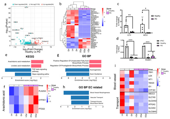 RNA expression analysis of hiPSC-derived endothelial cells from healthy donors and PD patients. (a) Volcano plot of up- and downregulated DEGs between healthy and PD ECs based on p-value (<0.05) and absolute log2 Fold > 1. (b) Cluster heatmap of the top 30 DEGs between healthy and PD ECs based on the p-value (<0.05). (c) Gene expression levels of POU5F1 and SOX2 in healthy and PD ECs compared to hiPSCs, assessed by qPCR. n = 2 (hiPSCs), n = 6 (healthy), n = 5 (PD LRRK2), two-way ANOVA. (d) Gene expression of KLF4 and MEG3 in healthy and PD ECs quantified with qPCR compared to healthy. KLF4 n = 7 (healthy), n = 6 (PD LRRK2), MEG3 n = 6 (healthy), n = 5 (PD LRRK2). Unpaired t-test. (e) KEGG pathway of up- and downregulated genes in PD ECs compared to healthy. (f) Heatmap showing genes related to arachidonic acid metabolism in healthy and PD ECs. (g) GO pathway of up- and downregulated genes in PD ECs compared to healthy. (h) GO biological processes related to vascular or EC function of up- and down-regulated genes in PD ECs compared to healthy. (i) Heatmap showing genes related to blood vessel morphogenesis and vascular transport/transport across BBB in healthy and PD ECs. KEGG, the Kyoto Encyclopedia of Genes and Genomes; GO BP, gene ontology biological processes; PD1–3, patients carrying a mutation in LRRK2 gene (G2019S.) Data shown as mean ± SD. * p < 0.05, ** p < 0.01, *** p < 0.001.