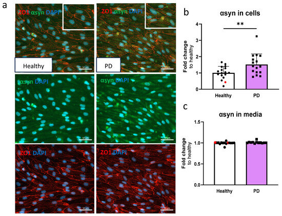 Given that α-synuclein accumulation is one of the hallmarks of PD, we quantified the amounts of α-synuclein in ECs. The presence of α-synuclein was detected in ECs by immunostaining (Figure 3a) and measured using ELISA. The amount of α-synuclein in LRRK2 mutant ECs was significantly higher compared to the healthy cells (Figure 3b). No differences in secreted α-synuclein were observed in the media (Figure 3c).