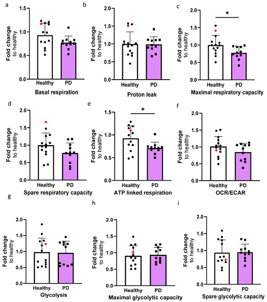 The altered metabolic profile in PD endothelial cells. Oxygen consumption rate (OCR) and extracellular acidification rate (ECAR) were measured with Seahorse XF assay. (a–e) Calculated OCR values of basal respiration, proton leak, maximal respiration, spare respiratory capacity, and ATP linked respiration, respectively. (f) OCR/ECAR ratio from basal level. (g–i) Calculated ECAR values of glycolysis, maximal glycolytic capacity, and spare glycolytic capacity, respectively. Data shown as fold change to healthy + isogenic. n = 11–12 (healthy), 1 (isogenic, marked as red), 10–11 (PD LRRK2) from five independent experiments. Data shown as mean ± SD. Unpaired t-test, * p < 0.05.
