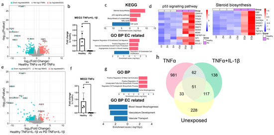 Given that the ECs of both genotypes responded to inflammatory stimuli (Figure S4), next we wanted to examine the differences between healthy and PD ECs after being exposed to inflammation. The exposure to TNFα altered the gene expression between healthy and PD ECs. Specifically, 609 genes were found to be downregulated and 522 upregulated (Figure 5a). The pluripotency genes SOX2 and POU5F1 were shown to be reduced in PD ECs, but their expression levels were similar to those in nonexposed cells (raw data). As in nonexposed cells, MEG3 expression was decreased in PD ECs, and this finding was further validated using qPCR (Figure 5b). The KEGG pathway analysis revealed that upregulated genes were connected to steroid biosynthesis, the p53 pathway, and the biosynthesis of unsaturated fatty acids whereas downregulated genes were linked to cell cycle (Figure 5c,d). The GO pathways were associated with cell migration and vascular endothelial growth factor production for upregulated genes and EC proliferation for downregulated genes (Figure 5c). The exposure to TNFα+IL-1β resulted in the upregulation of 91 genes and the downregulation of 277 genes, which was in the same range as in the nonexposed condition (Figure 5e). Once again, pluripotency genes SOX2 and POU5F1 were downregulated in PD ECs but the levels were unchanged from the nonexposed cells (raw data). The expression of MEG3 was found to be downregulated in PD ECs, as it was seen in TNFα and nonexposed cells. The gene expression was confirmed with qPCR (Figure 5f). Altered pathways of upregulated genes were related to mast cell activation, the regulation of unsaturated fatty acid and prostaglandin biosynthesis processes, while GO pathways related to ECs were linked to blood vessel morphogenesis, vasculature development and vascular transport in downregulated genes (Figure 5g). Altogether, the changes between healthy and PD ECs were more prominent with TNFα alone, whereas, the TNFα+IL-1β combination did not lead to additional patient specific changes when compared to the unexposed condition (Figure 5h).