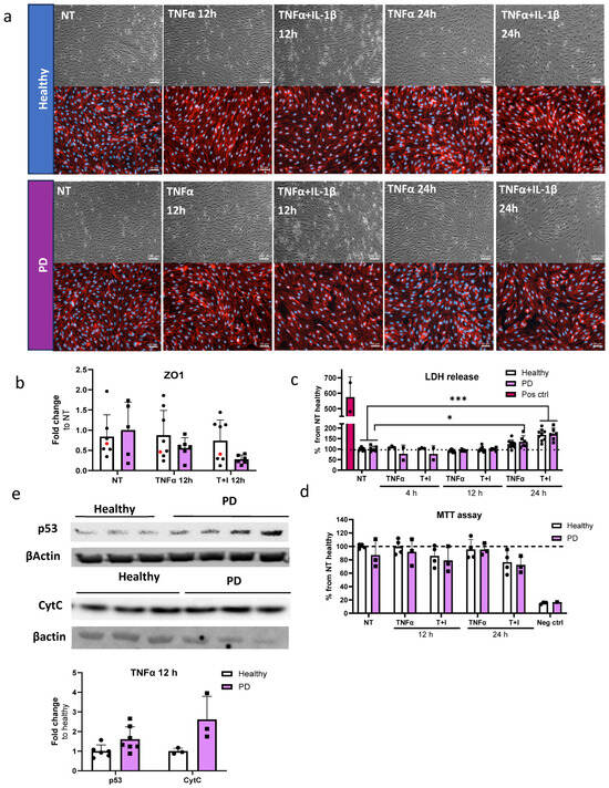 Cell viability and cytotoxicity in endothelial cells after inflammatory stimuli. (a) Representative bright field (upper panel) and immunofluorescence images stained for ZO1 (lower panel) of ECs, nonexposed (NT), 12 h TNFα and TNFα+IL-1β exposed, 24 h TNFα and TNFα+IL-1β exposed. Scale bar 50 µm. (b) Quantification of the immunocytochemistry. Fluorescence normalized to DAPI. n = 6–7 (Healthy), 1 (isogenic),5–6 (PD LRRK2) from two independent experiments. (c) LDH release from ECs of non-exposed and after 4, 12 and 24 h TNFα and TNF+IL-1β (T+I) exposure. n = 3–9 (healthy), 2–6 (PD LRRK2) from two independent experiments. (d) MTT assay of non-treated and 12 and 24 h TNFα and TNF+IL-1β treated ECs. n = 2–4 (healthy), 1–3 (PD LRRK2). (e) Western blot analysis of p53 and Cytochrome C (CytC) in healthy and PD EC normalized to β-actin protein levels. Representative images and quantification of the data. n = 3–6 (healthy), 3–7 (PD LRRK2). Data shown as mean ± SD. Two-way ANOVA with Tukey’s multiple comparison test, * p < 0.05, *** p < 0.001.