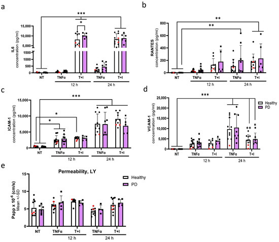 To assess the effect of inflammatory exposures on the secretion of cytokines from endothelial cells, we first exposed the cells to TNFα or a combination of TI for either 12 or 24 h. IL-6 release was especially increased after combination exposures. At 12 h, the release was significantly higher in PD ECs, with no difference at a later time point when compared to healthy ECs (Figure 7a). An elevation in the release of RANTES was observed at 12 h in both healthy and PD ECs following TI exposure (Figure 7b). This elevation persisted at 24 h with no differences between genotypes, likely due to large variability among the lines that responded. The levels of ICAM1 gradually increased over time. However, various exposures did not have a significant impact on the response of both healthy and PD ECs (Figure 7c). Although, a decrease in ICAM1 levels was observed in PD ECs after 24 h combination exposure. The release of VCAM1 was highest after 24 h of TNFα exposure, but no differences were seen between healthy and PD ECs (Figure 7d). We further investigated the permeability using LY under the same inflammatory stimulating condition (Figure 7e). No changes in permeability were detected between healthy and PD ECs. However, the inflammatory conditions slightly increase the permeability at 12 h; still, this change was not statistically significant.