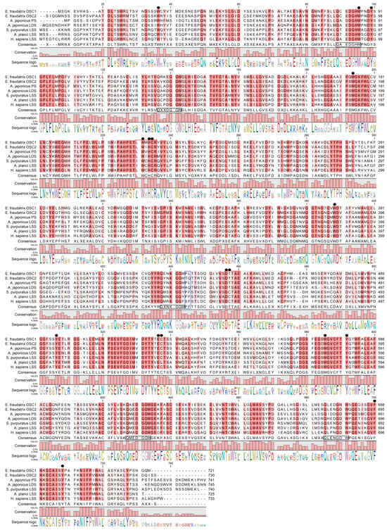 Alignment of OSCs proteins from sea cucumbers, sea urchin, starfish, and human. E. fraudatrix OSC1 and OSC2 (OR725688 and OR711403 in this study); A. japonicus LAS1 (PS) and LAS2 (LDS) (ON478352.1 and ON478353.1, respectively); A. parvimensis PS and LDS (ON478351.1 and ON478350.1); S. horrens OSC1 and OSC2 [14]; LSS: A. planci (XM 022227483.1), S. purpuratus (ON478349.1), H. sapiens (NM 002340.6). Conservative residues are in red colors. Active site residues are indicated by black circles. QXXXW motifs are marked on a consensus sequence by black boxes. LWIHCR and DTTAE motifs are marked by red boxes. Key residues, which determine enzyme function, are labeled with the blue box.