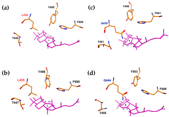 Based on the resulting 3D models (Figure 2), the location of the residues of leucine (436L/435L) in EfOSC1/AjLAS1 and glutamine (439Q/444Q) in EfOSC2/AjLAS2, as well as threonine (448T/447T or 451T/456T), tyrosine (Y496/Y495 or Y498/Y503), and phenylalanine (F688/F690 or F691/F696) ones near the B ring of lanostadienol (Figure 2c,d) or C ring of parkeol (Figure 2a,b), is characterized by high structural similarity, suggesting that these particular residues, 436L and 439Q, may determine product specificity in the EfOSCs.