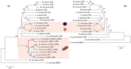 Maximum likelihood (ML) phylogenetic trees based on amino acid sequences of OSCs with (a) and without (b) sea cucumbers: H. sapiens (NM 002340.6), B. taurus (NM 001046564.1), M. musculus (XM 036155651.1), B. belcheri (XM 019790446.1), S. kowalevskii (XM 006825036.1), L. anatina (XM 013562424.1), L. gigantea (XM 009046756.1), P. canaliculata (XM 025240299.1), L. variegatus (XM 041622296.1), S. purpuratus (ON478349.1), P. miniata (ON478348.1), A. planci (XM 022227483.1), T. adhaerens (XM 002110738.1), A. queenslandica (XM 003383129.3), E. fraudatrix OSC1 (OR725688, this study), E. fraudatrix OSC2 (OR711403, this study), A. japonicus LAS1 (ON478352.1), A. japonicus LAS2 (ON478353.1), A. parvimensis PS (ON478351.1), A. parvimensis LDS (ON478350.1), S. horrens OSC1 [14], S. horrens OSC2 [14], D. discoideum (XM 641154.1), and S. cerevisiae (NP 011939.2).