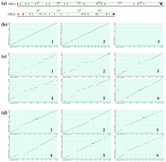 Comparison of E. fraudatrix OSCs gene structures and their haplotypes. (a) Gene structure schemes. (b) Scatter plots of OSC1 and OSC2 transcripts (1), deduced amino acid sequences (2), and gene sequences (3) comparison. (c) Scatter plots of pairwise alignment through BLAST of four OSC1 gene haplotypes (comparison 1—haplotypes 1 and 2; 2—haplotypes 1 and 3; 3—haplotypes 1 and 4; 4—haplotypes 2 and 3; 5—haplotypes 2 and 4; 6—haplotypes 3 and 4). (d) Scatter plots of pairwise alignment through BLAST of four OSC2 gene haplotypes (comparison 1—haplotypes 1 and 2; 2—haplotypes 1 and 3; 3—haplotypes 1 and 4; 4—haplotypes 2 and 3; 5—haplotypes 2 and 4; 6—haplotypes 3 and 4).