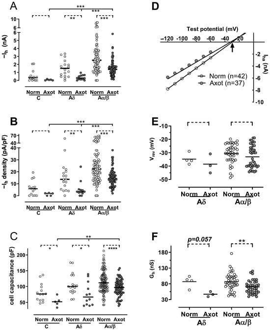 Ih at −100 mV in axotomized neurons was measured as described in the Section 4. Axotomized Aα/β-neurons exhibited a significantly higher Ih compared to Aδ- and C-neurons (p < 0.001 for both) (Figure 1A). In axotomized Aδ-neurons, the median Ih was −0.28 nA (n = 12), which represents an approximately 80% decrease compared to the median Ih in normal Aδ-neurons (−1.51 nA, n = 18, p < 0.01). Similarly, the median Ih in axotomized Aα/β-neurons (−1.39 nA, n = 76) decreased by 30% compared to normal Aα/β-neurons (−2.53 nA, n = 96) (p < 0.001). The median Ih in axotomized C-neurons (−0.06 nA, n = 5) was also reduced by 80% compared to normal C-neurons (−0.33 nA, n = 14), although this difference was not statistically significant (p = 0.06).