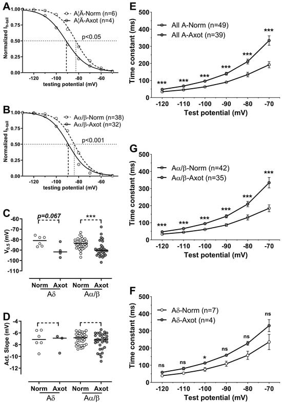 The Ih activation time constant (τact) was measured in 39 axotomized A-fiber neurons (4 Aδ- and 35 Aα/β-neurons) and compared with 49 normal A-fiber neurons (7 Aδ- and 42 Aα/β-neurons). The τact in axotomized A-neurons was significantly longer than that in normal A-neurons (p < 0.001 at all test potentials) (Figure 2E). For instance, at −100 mV, the medians for tact were 59 ms and 94 ms, respectively, in normal and axotomized A-fiber neurons. The τact was analyzed separately in Aα/β- and Aδ-neurons. Both axotomized Aα/β- and Aδ-neurons exhibited longer τact; however, the change was significant only in axotomized Aα/β-neurons across all test potentials (p < 0.001 for all cases) (Figure 2F). In axotomized Aδ-neurons, and τact was significantly longer only at −100 mV (p < 0.05) (Figure 2G). The lack of significance for Aδ-neurons may be attributed to the small sample size (n = 7 for normal vs. n = 4 for axotomized).