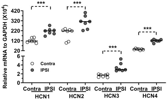 Regarding the expression of HCN1-4 mRNA in contralateral L5 DRGs, the current findings suggest that HCN1 and HCN2 are the most prevalent isoforms in DRG neurons, followed by HCN4, while HCN3 is present at significantly lower levels (approximately one-tenth that of HCN1). This observation aligns with the previous studies conducted by Chaplan et al. [] and Kouranova et al. [], which also reported high levels of HCN1 and HCN2 in DRG neurons. The low expression of HCN3 in the current study is consistent with the results reported by Chaplan et al.; however, Kouranova et al. observed a considerably higher expression of HCN3, comparable to that of HCN1. This discrepancy may be attributed to differences in methodologies employed between these studies. While Chaplan et al. and the current study extracted mRNA from whole DRGs, Kouranova et al. isolated mRNA from a specific population of 100–150 DRG neurons categorized by size. It is plausible that Kouranova’s study included a small subpopulation of DRG neurons with relatively high HCN3 expression.