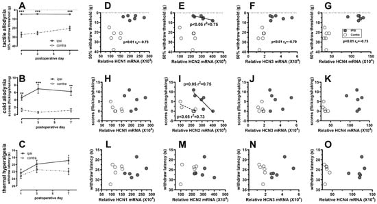 When both the ipsilateral and contralateral data were aggregated, Spearman’s rank correlation analysis was utilized to evaluate the correlations. The results indicated that only tactile allodynia demonstrated a negative correlation with the mRNA levels of HCN1, HCN3, and HCN4.