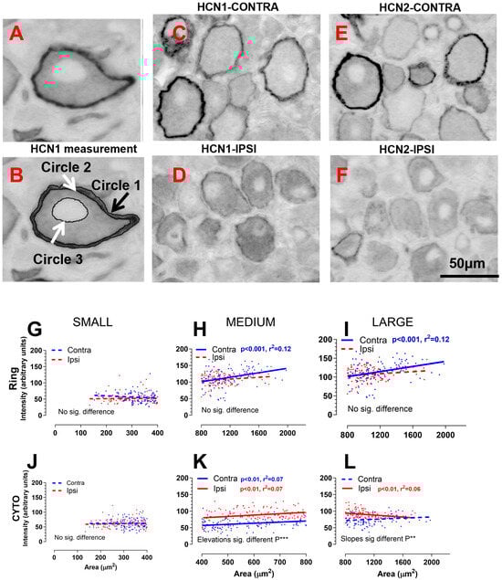 In small neurons, the intensity of the HCN1 ring and cytoplasmic levels remained consistent across different neuronal areas, showing no significant differences between the ipsilateral and contralateral sides (see Figure 5G,J). In medium-sized neurons, both the HCN1 ring and cytoplasmic intensity displayed a linear correlation with the neuronal size, indicating elevated levels in neurons of larger dimensions. When comparing the ipsilateral side to contralateral L5 DRG neurons, both the HCN1 ring and cytoplasmic intensity were significantly higher on the ipsilateral side (see Figure 5H,K). In large neurons, only the intensity of the HCN1 ring exhibited a positive correlation with the neuronal size on the contralateral side, with a darker ring observed in larger contralateral L5 neurons (see Figure 5I). Axotomized large neurons demonstrated an increased HCN1 cytoplasmic intensity, but a decrease in the HCN1 ring intensity when compared to L5 DRG neurons on the contralateral side (see Figure 5I,L).