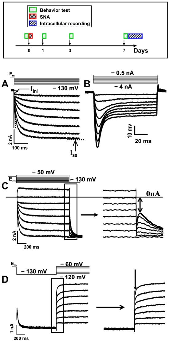Experimental procedure and recording and measurement of Ih and kinetics. Upper panel, the time scale procedure for SNA, behavioral test, and intracellular recording. (A), the protocol and example of Ih recording by utilizing discontinuous single-electrode voltage clamp (d-SEVC) technique. Ih amplitude was measured as the difference between Iss and Iini (as arrow shown in the traces); (B), the depolarizing sag recorded under discontinuous current clamp (DCC) mode; (C), the deactivating current traces for measurements of reversal potential (Vrev) and neuronal conductance (Gh); and (D), the activating current traces for measurement of half activation potential (V0.5).