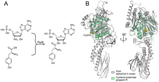 The BGC of puromycin provides clues for puromycin biosynthesis. However, we are still far from a detailed mechanism of it. The most uncommon step in puromycin biosynthesis is the coupling of amino acid tyrosine and nucleotide moieties (Figure 1A). According to puromycin BGC, this step must be mediated by a unique enzyme, Pur6 []. Pur6 is particularly interesting since this 84 kDa protein has no known conserved domains that could be identified by its sequence homology. Moreover, its AlfaFold 3 structure model has only weak and partial structural homology with cysteine proteinase gingipain R, which is the most proximate structural homolog known yet (Figure 1B).